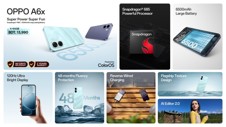 দেশে আনুষ্ঠানিকভাবে গত ৪ ডিসেম্বর থেকে শুরু হয়েছে অপো এ৬এক্স। স্ট্রেন্থ, স্মুথনেস ও সারাদিনের নির্ভরযোগ্যতার সমন্বয় হবে ডিভাইসটি এমন দাবি অপোর।