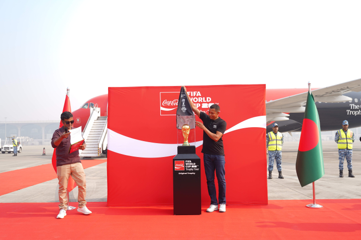 বাংলাদেশে ফুটবলের স্বপ্ন বাস্তবে রূপ নিল আজ, যখন ফিফা বিশ্বকাপ মূল ট্রফি সকাল ১০টায় হযরত শাহজালাল আন্তর্জাতিক বিমানবন্দরের টার্মিনাল ৩-এ এসে পৌঁছায়। এটি দেশের কোটি কোটি ফুটবলপ্রেমীর জন্য এক ঐতিহাসিক মুহূর্ত। ফিফা বিশ্বকাপ ট্রফি ট্যুর বাই কোকা-কোলা’র অংশ হিসেবে বিমানবন্দরের টারম্যাকে আয়োজিত এক আনুষ্ঠানিক উন্মোচন অনুষ্ঠানের মাধ্যমে এই আগমন উদযাপন করা হয়, যা ফিফা বিশ্বকাপ ২০২৬-এর আগে বিশ্বের অন্যতম আইকনিক ক্রীড়া প্রতীককে বাংলাদেশি সমর্থকদের আরও কাছে নিয়ে আসে।