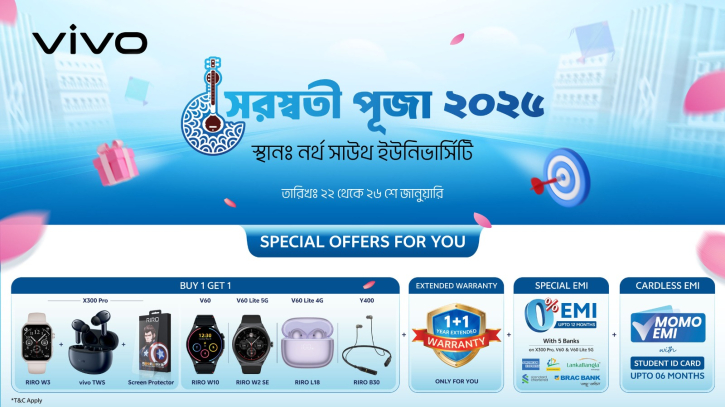 নর্থ সাউথ ইউনিভার্সিটির ‘সরস্বতী পূজা ২০২৬’-এর টাইটেল স্পন্সর হিসেবে গ্লোবাল স্মার্টফোন ব্র্যান্ড ভিভো নিয়ে এসেছে দারুণ সব টেক-অভিজ্ঞতা এবং এক্সক্লুসিভ অফার। উৎসবের প্রতিটি দিন আরও উৎসবমুখর ও স্মরণীয় করতে ক্যাম্পাসজুড়ে থাকছে ভিভোর বিশেষ আয়োজন।