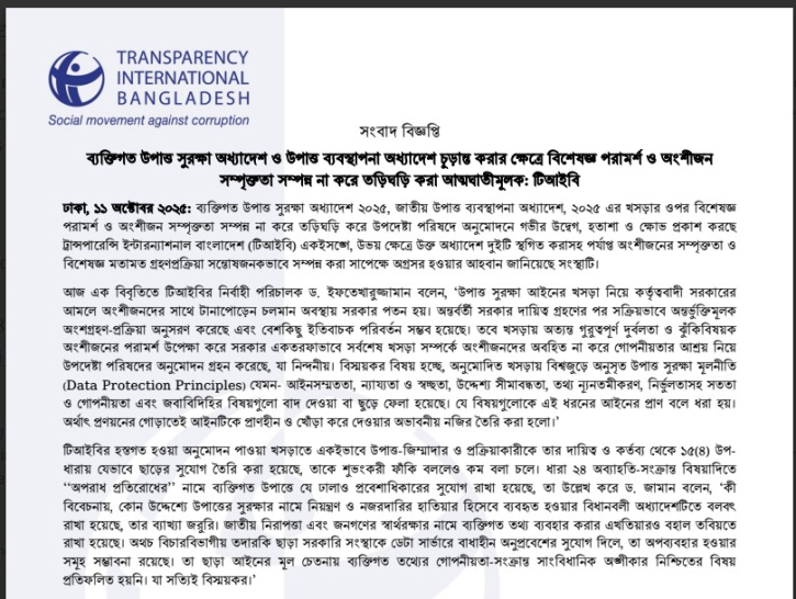 বিশেষজ্ঞ পরামর্শ ও অংশীজন সম্পৃক্ততা সম্পন্ন না করে ব্যক্তিগত উপাত্ত সুরক্ষা অধ্যাদেশ ২০২৫, জাতীয় উপাত্ত ব্যবস্থাপনা অধ্যাদেশ, ২০২৫ এর খসড়া উপদেষ্টা পরিষদে অনুমোদনে হতাশা জানিয়েছে ট্রান্সপারেন্সি ইন্টারন্যাশনাল বাংলাদেশ--টিআইবি। একইসঙ্গে, উভয় ক্ষেত্রে উক্ত অধ্যাদেশ দুইটি স্থগিত করাসহ পর্যাপ্ত অংশীজনের সম্পৃক্ততা ও বিশেষজ্ঞ মতামত গ্রহণপ্রক্রিয়া সন্তোষজনকভাবে সম্পন্ন করা সাপেক্ষে অগ্রসর হওয়ার আহবান জানায় সংস্থাটি।